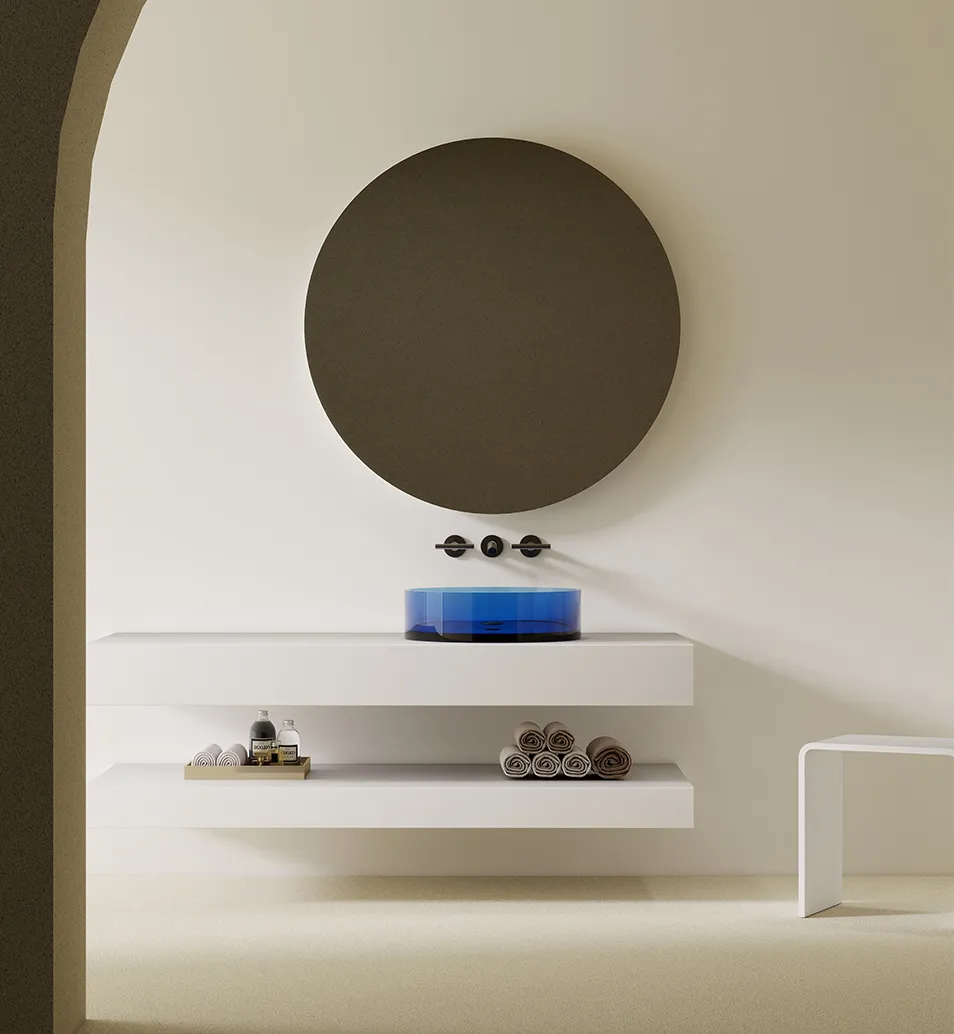 This transparent resin countertop basin masterfully blends minimalism with artistic texture. Crafted from translucent resin, its luminous quality yields a gem-like visual effect. Light refraction creates dynamic spatial layers, infusing the bathroom with a cool, sophisticated ambiance. Adhering to a pure circular geometric silhouette, the basin's vertical lines are clean and crisp. Its minimalist form, devoid of superfluous ornamentation, aligns with the modernist design philosophy of “less is more.” Representing a crossover expression of contemporary minimalism and light luxury, the resin's translucent artistry highlights refined details within a simple aesthetic. It complements spaces pursuing ultimate simplicity and a preference for cool, sophisticated aesthetics. Whether in the bathroom of an urban apartment or as a washbasin in a minimalist commercial space, its visual purity and unique material properties make it a standout design feature.
