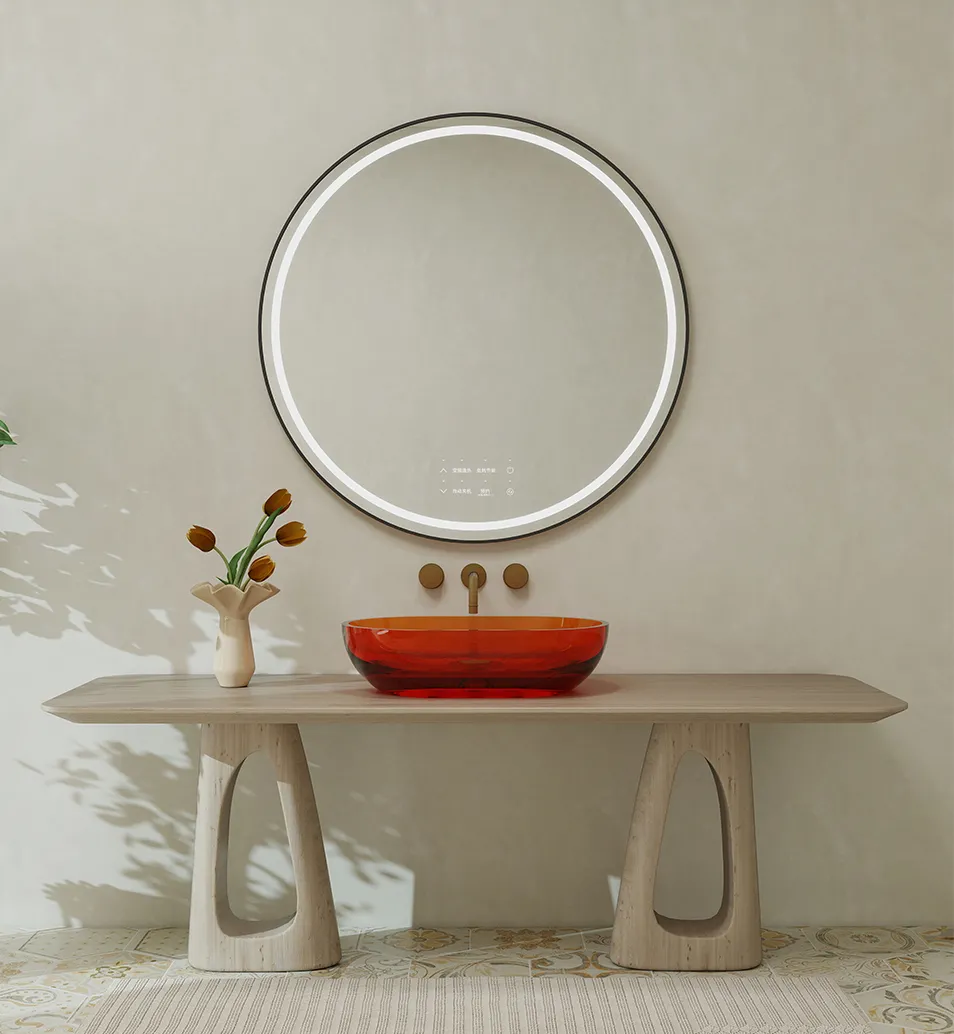 This countertop basin features a transparent resin material with a crystalline, layered texture that breaks away from the monotony of traditional ceramic bathroom fixtures. It injects powerful visual tension into the space, becoming an artistic focal point within the bathroom setting. Following the gentle contours of an ellipse, its rounded edges flow smoothly, aligning with ergonomic usage habits while softening spatial angles through organic forms. This design echoes the curves of the circular smart mirror above, creating a harmonious sense of rhythm. This fusion of styles crafts a distinctive bathroom aesthetic. It suits spaces seeking individuality and favoring artistic home atmospheres. Whether as a standout design in a guesthouse or a creative bathroom feature in a private residence, its visual impact and thoughtful design elevate the overall space's sophistication and memorability.