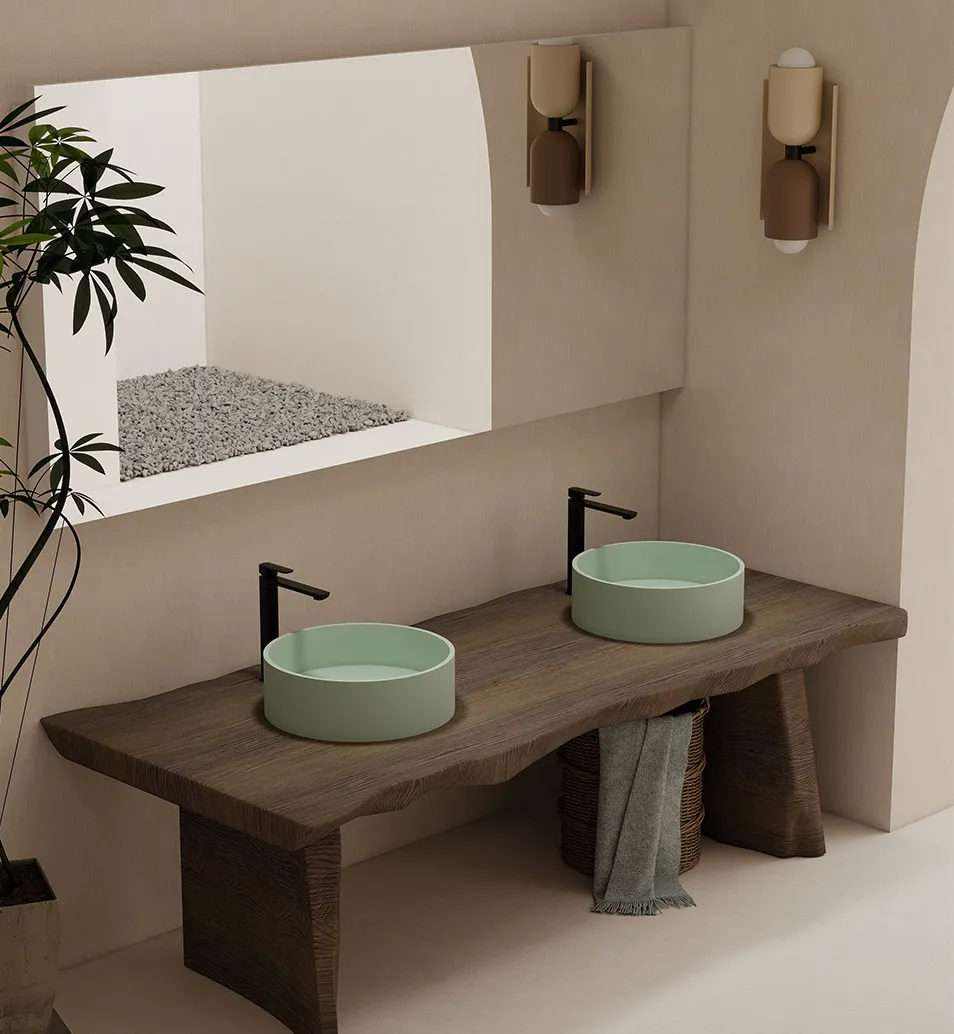 This solid surface countertop basin masterfully blends natural aesthetics with modern craftsmanship. Crafted from solid surface it offers a smooth, warm texture that combines durability with easy maintenance. Its fresh hue brings a fresh, elegant touch, infusing spaces with natural vitality while effortlessly complementing diverse bathroom styles. The basin's form features a sleek, minimalist design with smooth, rounded contours. It aligns with contemporary aesthetics' pursuit of simplicity while creating a warm, inviting visual experience through its gentle curves. This basin seamlessly complements natural-themed bathrooms and integrates effortlessly into Scandinavian or light luxury-inspired spaces, serving as a defining accent that elevates the room's sophistication. Whether used for daily grooming or as a focal point, it consistently showcases its distinctive design charm.