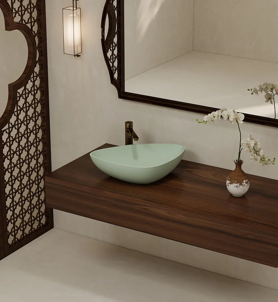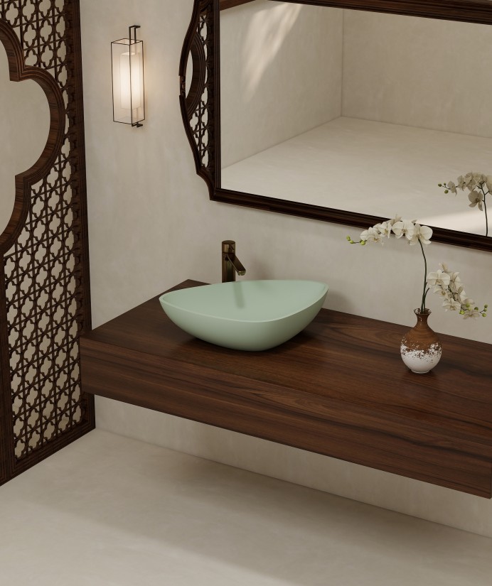 This countertop basin is crafted from premium solid surface, featuring a smooth, warm surface that combines the texture of natural stone with the resilience of resin. It resists stains and is easy to clean, while its seamless, one-piece construction enhances durability and elevates the overall sense of refinement. Its triangular arc contour breaks away from the rigidity of traditional circular or square designs. Soft curves soften the sharpness of the triangle, creating a visual tension that balances geometric precision with gentle elegance. This design complements modern bathroom styles that embrace individuality, making it a striking focal point in any space. The triangular form optimizes workflow within compact spaces. Paired with a tall faucet, it ensures comfortable washing height while harmonizing materials and colors to unify function and aesthetics. This creates a bathroom experience that blends practicality with artistic appeal.
