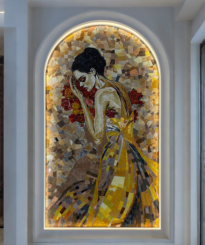 In its design language, “Golden Rhapsody” employs a fusion of abstract composition and figurative depiction. The woman's face and arms are rendered realistically, conveying quiet, contemplative emotion, while the background and skirt are reconstructed through geometric planes to trace the trajectory of movement, symbolizing the twist of time and space. A mosaic of diverse materials—matte, mirrored, translucent, metallic—interweaves to enrich the layers of light and the emotional tension of the composition. This allows the work to reveal shifting beauty when viewed at different times and angles.
