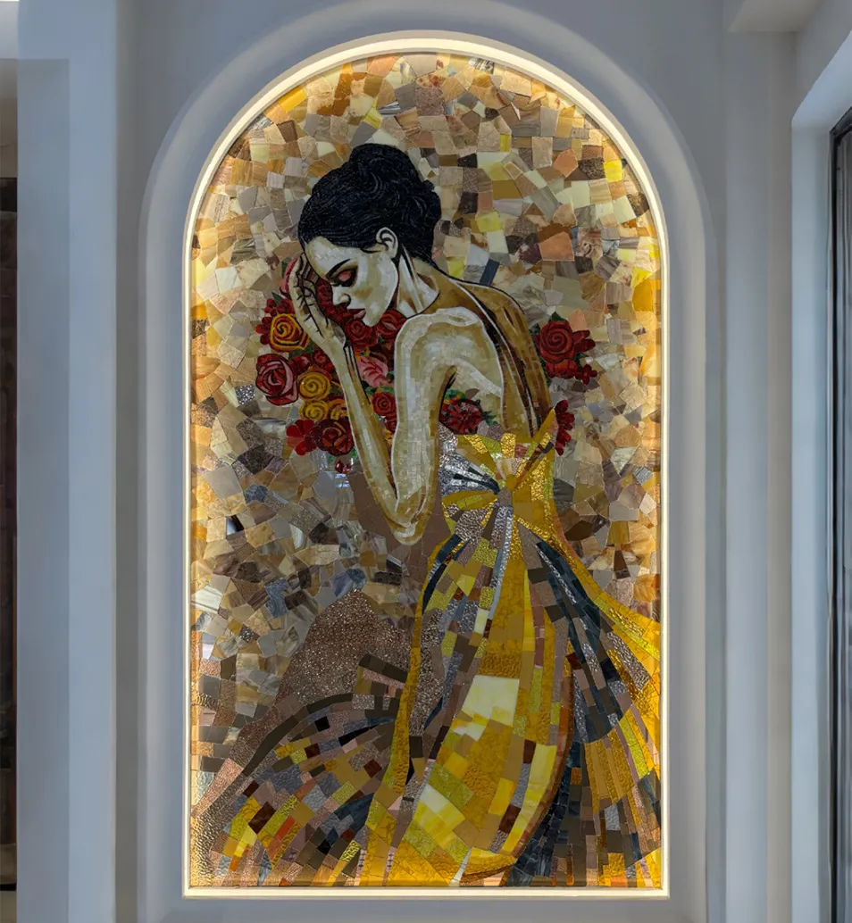 Combining different colored stones and glass particles creates a rich spectrum ranging from vibrant to soft and elegant hues. Glass mosaics, in particular, achieve gradient lighting effects by adjusting material transparency, adding depth and dimension to the artwork.