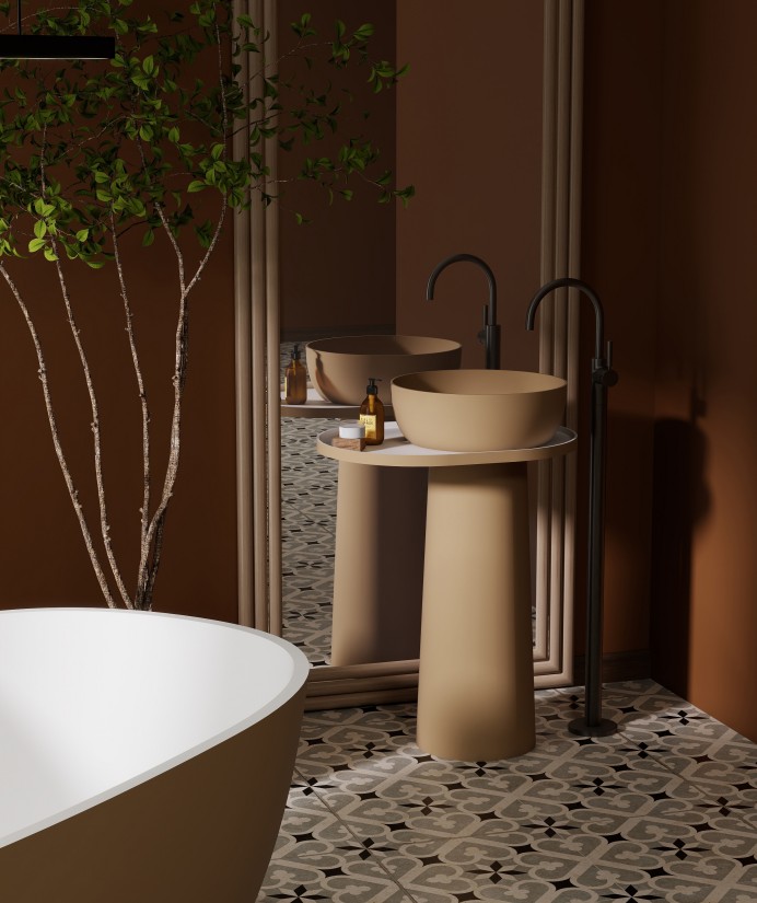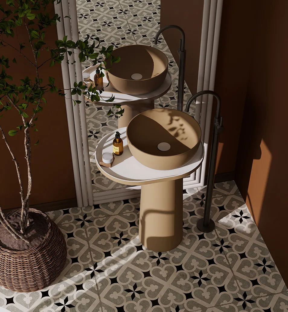 This solid surface pedestal basin features a circular basin seamlessly integrated with a matching-color pedestal, its rounded, approachable form instantly bridging the gap between user and space. Paired with a black floor-mounted faucet, the entire design exudes a rich, vintage-inspired luxury. It appears like an elegant gentleman stepping out of a time corridor, blending vintage warmth with refined luxury. Placing toiletries on the countertop adds a touch of everyday life, transforming the bathroom into a cozy corner that harmonizes aesthetics with functionality. This creates an immersive, vintage-inspired luxury experience for the user.