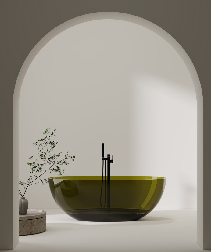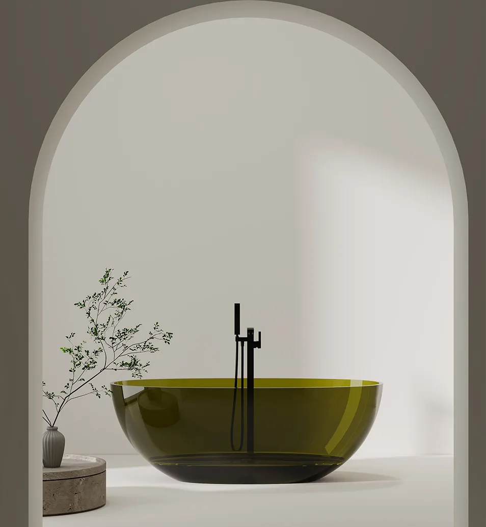 Crafted from transparent resin, the material's translucency preserves visual lightness while infusing the space with powerful artistic tension through its color. The resin's crafting properties enable this rounded, bowl-like form with a mirror-smooth surface, combining durability with distinctive visual appeal. Its minimalist geometric hemispherical silhouette breaks from traditional bathtub designs, featuring fluid lines and sculptural presence reminiscent of contemporary art installations. Pairing with a matte black metal faucet creates a striking “color + material” contrast. This enhances the crisp modern minimalism while generating a light luxury ambiance through color collision, making it suitable for diverse spatial styles like wabi-sabi, minimalist, and art-inspired mansions. It fulfills bathroom functionality while serving as a core carrier for elevating the artistic tone of the space, delivering an immersive aesthetic bathing experience for users.