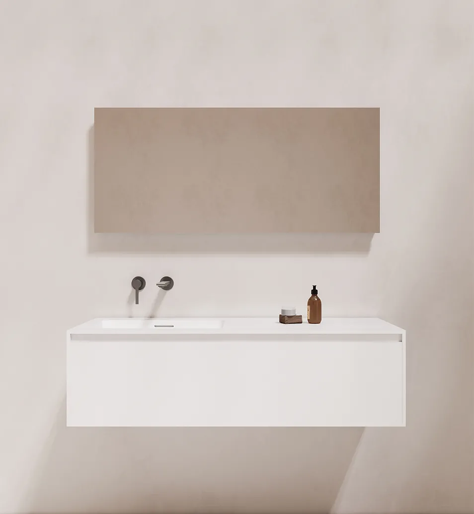 Crafted using an integrated solid surface molding process, the basin and countertop of this solid surface vanity top basin form a seamless whole. Its design is clean and square, with crisp, decisive lines. Flexible customization options include single or double basin configurations—single basin saves space in compact homes, while double basin enhances efficiency in larger spaces. The monolithic design delivers superior waterproofing and leak resistance, accommodating various faucet installations. Minimalist aesthetics highlight the craftsmanship, while the material's high malleability enables diverse customization in color and detailing.